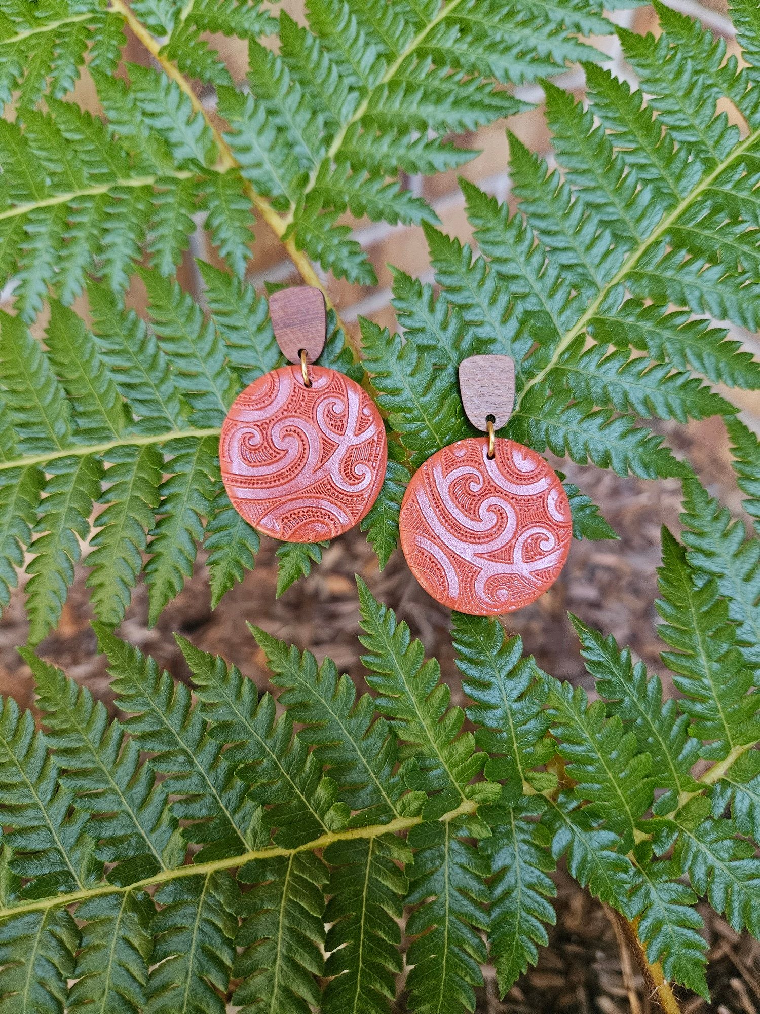 Delicately handmade polymer clay earrings, embossed maori designs with walnut fixings to complete this stunning pair.